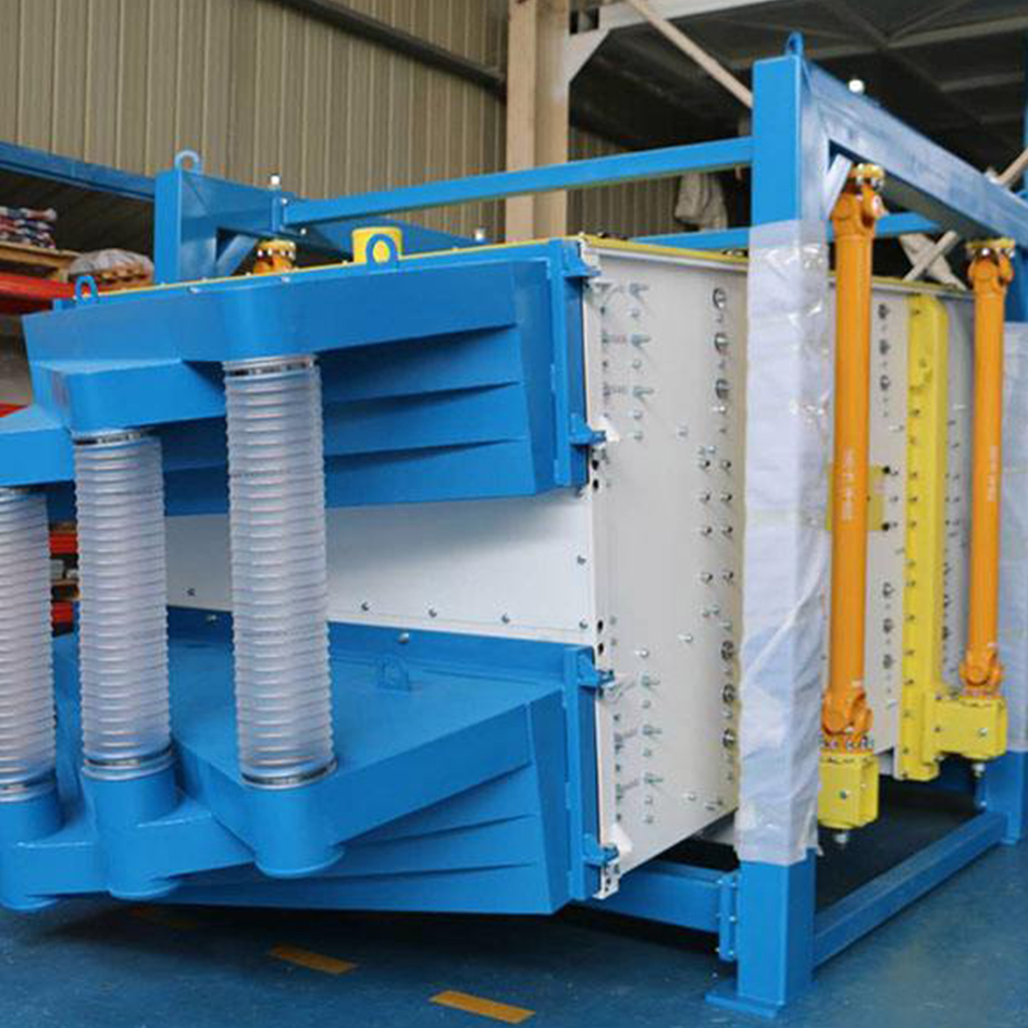 方形搖擺篩通過(guò)在篩體的不同部位增加在兩個(gè)或多個(gè)激振器,來(lái)改變方形搖擺篩的運(yùn)動(dòng)軌跡,可以使物料在剛接觸篩網(wǎng)時(shí)做較大的圓周運(yùn)動(dòng),充分利用了篩網(wǎng)的面積,隨著物料向出料口運(yùn)動(dòng),逐漸的減小物料左右運(yùn)動(dòng)的力而前后運(yùn)動(dòng)力增強(qiáng),呈現(xiàn)圓周逐步被拉長(zhǎng),至直線(xiàn)的螺旋前進(jìn)趨勢(shì),這樣使接近網(wǎng)孔的物料有相對(duì)短暫的時(shí)間在篩網(wǎng)上停留,而接著 又被動(dòng)做前后運(yùn)動(dòng),產(chǎn)生直線(xiàn)往復(fù)篩的篩選特性,令接近網(wǎng)孔的物料可以順利篩下,進(jìn)而使 物料在不同運(yùn)動(dòng)軌跡的情況更容易通過(guò)篩孔,提高了篩分的精度,提高整體的產(chǎn)量,便于清網(wǎng),提高生產(chǎn)效率。